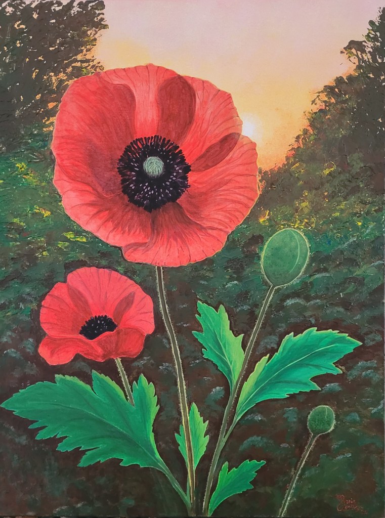 Comme des petites taches qui criblent les champs, les coquelicots apportent leur couleur vive à la nature. Le pigment vif qui irise leurs pétales pâlit presque à contre-jour. La fleur du coquelicot est aussi éclatante que fragile ! En choisissant de la peindre, j’ai voulu figer son fragile éclat…